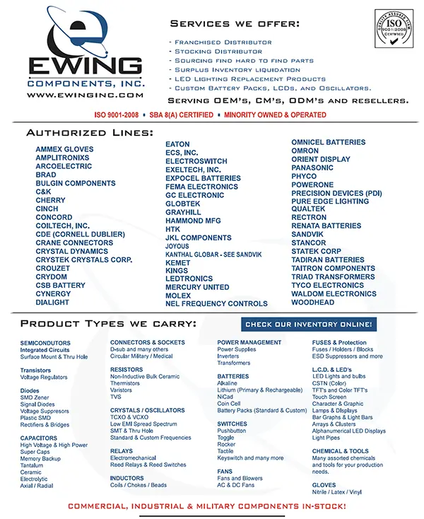 Ewing Components, Inc. is a trusted, authorized distributor of a broad range of board-level electronic components—including active, passive, and electromechanical parts. We provide cutting-edge, current, obsolete, and hard-to-find components to meet the diverse needs of our customers. For over 30 years, our commitment to quality and complete customer satisfaction has been backed by our AS9120 and ISO9001 certifications.